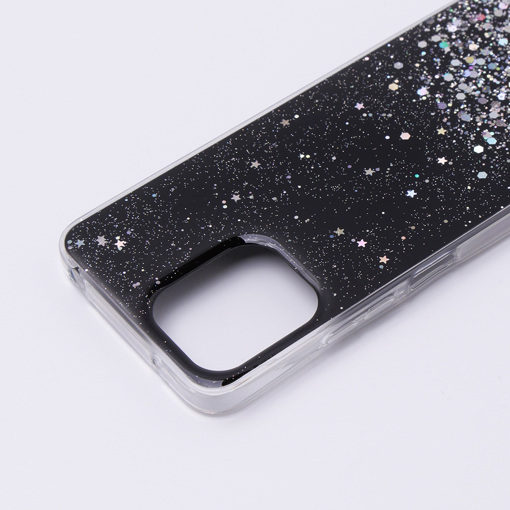 Partea din spate a carcasei are decupaje pentru camera foto. Carcasa va oferi o protecție excelentă împotriva zgârieturilor, loviturilor, murdăriei și prafului. Datorită husei, spatele, părțile laterale și colțurile telefonului vor rămâne în siguranță. Părțile laterale ale carcasei sunt realizate dintr-un material flexibil din silicon care se adaptează perfect la telefon. Partea din spate a husei este realizată din plastic în care au fost încorporate sclipici cu steluțe (sclipiciul nu se revarsă). Cu siguranță va face ca smartphone-ul dvs. să iasă în evidență printre sutele de altele.