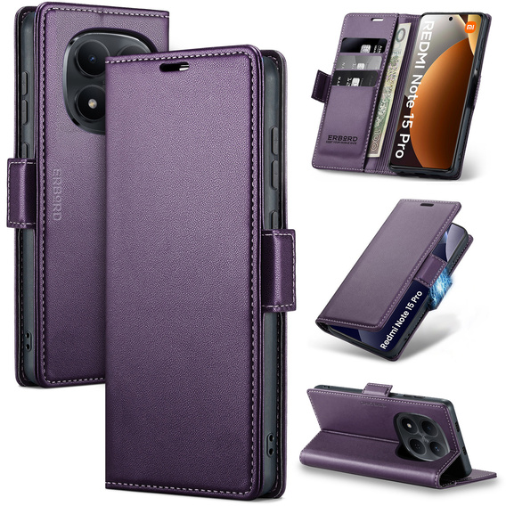 - 1 × husă tip portofel ERBORD Glossy Litchi pentru Xiaomi Redmi Note 15 Pro 4G – violet