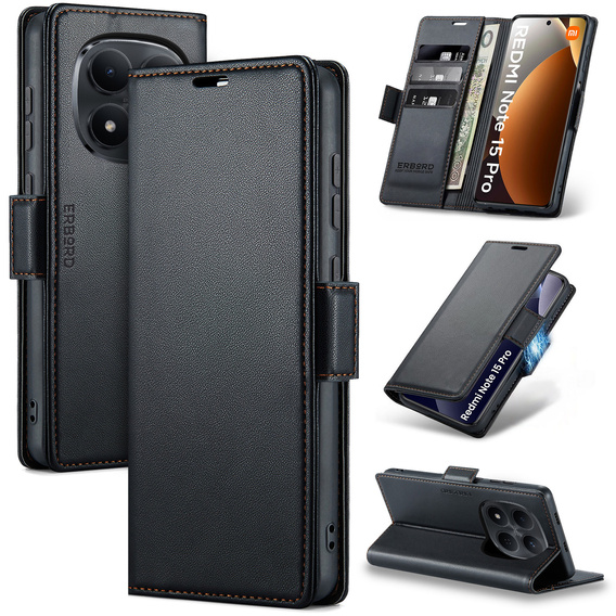 - 1 × Husa tip portofel ERBORD Glossy Litchi pentru Xiaomi Redmi Note 15 Pro 4G – negru