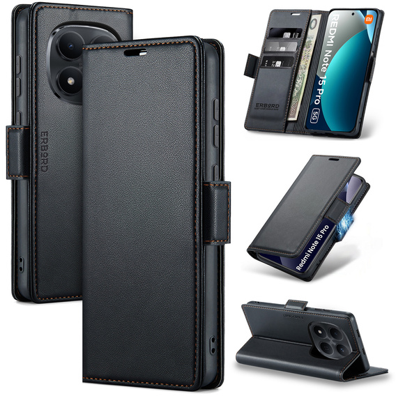 - 1 × Husa tip portofel ERBORD Glossy Litchi pentru Xiaomi Redmi Note 15 Pro 5G - negru